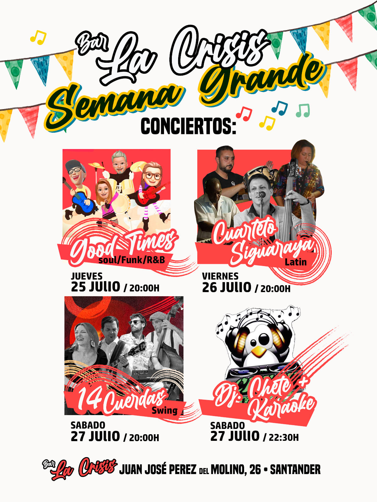 Música en directo, pinchos de feria, karaoke y fiesta en La Crisis (C/ Juan José Pérez del Molino 26) durante la Semana Grande.