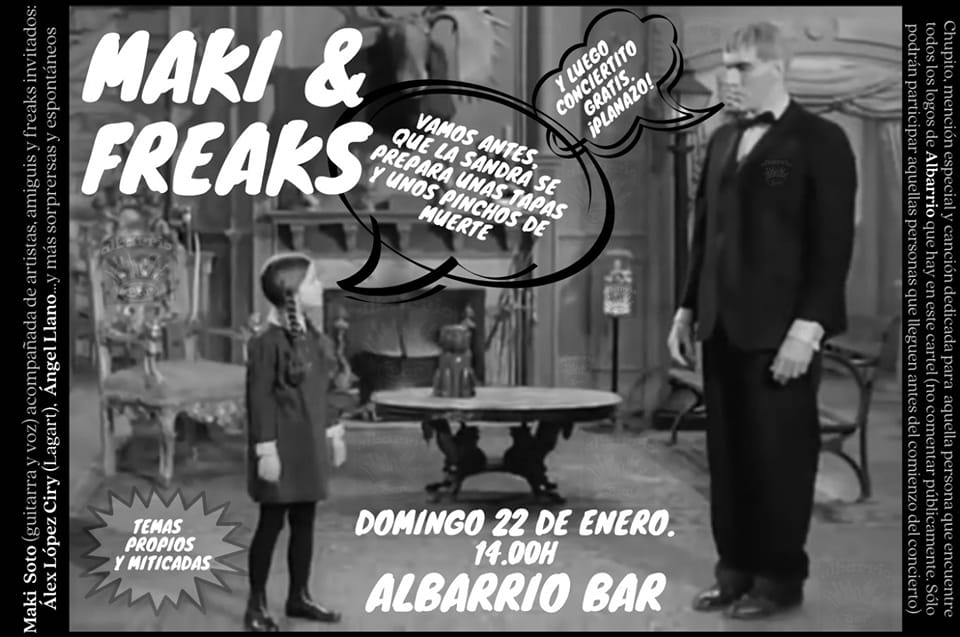Vuelve la música a Albarrio Bar este domingo 22 de enero de la mano de Maki Soto (guitarra y voz), que estará acompañada de artistas, amigos y “freaks” invitados.