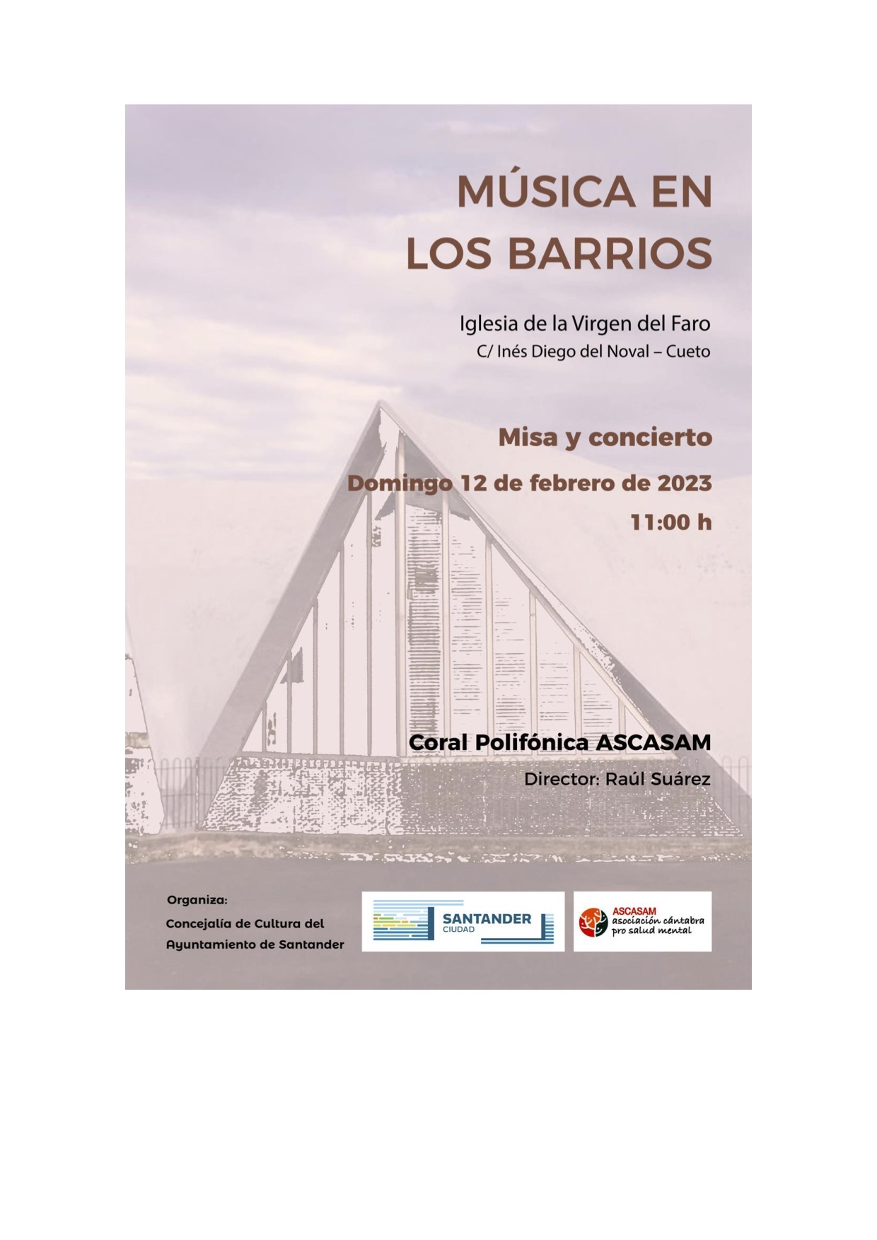 La Concejalía de Cultura reprograma el concierto de la Coral Polifónica ASCASAM en la Iglesia de Nuestra Señora del Faro (C/ Inés Diego de Noval, 6), correspondiente al ciclo Música en los Barrios, que tuvo que suspenderse el pasado mes de diciembre por enfermedad de algunos de los componentes de la agrupación musical.