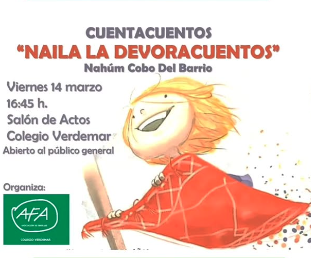 El viernes 14 de marzo, a las 16:45h, el salón de actos del Colegio Verdemar acoge la sesión de cuentacuentos “Naila la devoracuentos”, a cargo de Nahúm Cobo del Barrio.