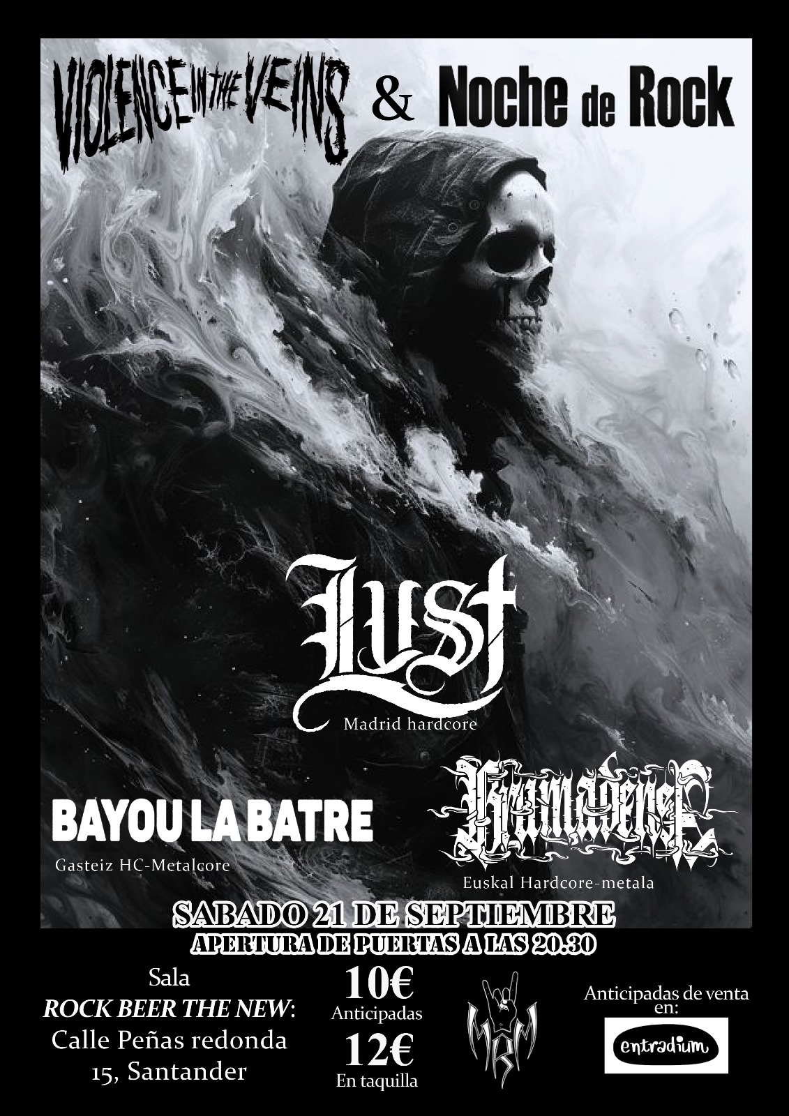 Violence in the veins y Noche de Rock abren la temporada, volviendo a unir fuerzas para brindar por lo que será una velada HC/METAL única. Brumadensa, Bayou La Batre y Lust se subirán al escenario del New el sábado 21 de septiembre desde las 20:30 horas.