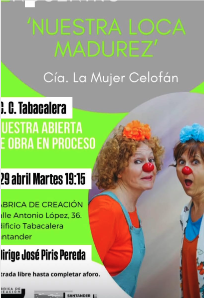 El 29 de abril a las 19:15 en el Centro Cívico deTabacalera, la compañía La Mujer Celofán hará una muestra de su obra de teatro clown que está aún en proceso “Nuestra loca madurez”, interpretada por Maria Antonia Martín Gil y Marian Sánchez Chico y dirigida por José Piris.