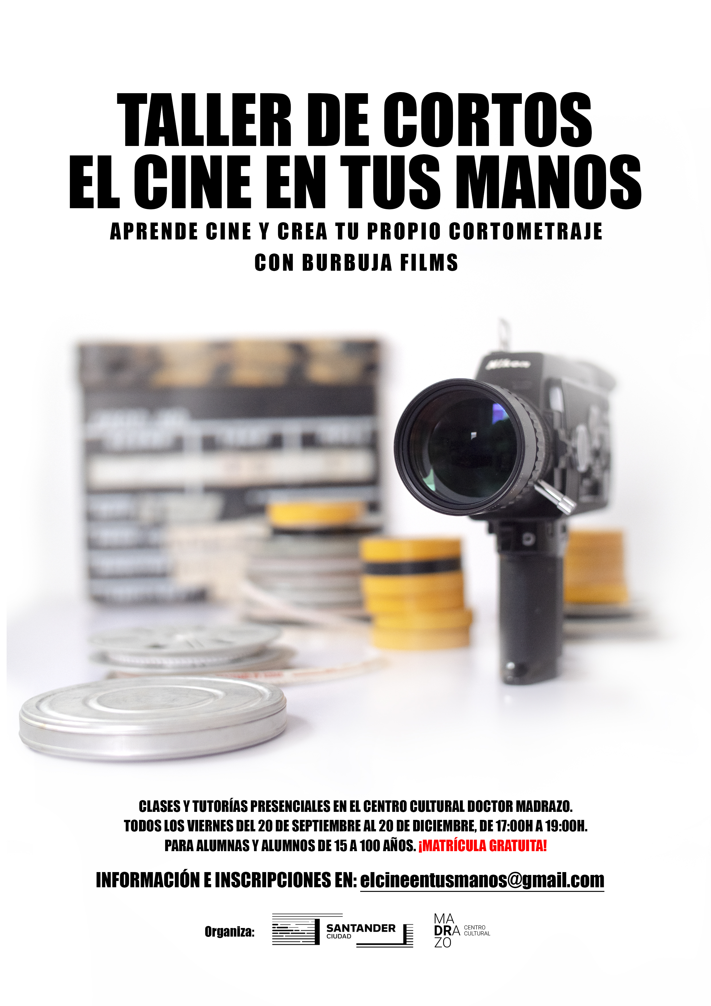 La Concejalía de Cultura de Ayuntamiento de Santander pone en marcha, un año más, una nueva edición de “El cine en tus manos”, un taller en el que se podrá aprender a grabar un cortometraje de ficción o documental de forma práctica y amena. Será impartido por la productora cántabra Burbuja Films, del 20 de septiembre al 20 de diciembre en el Centro Cultural Doctor Madrazo.