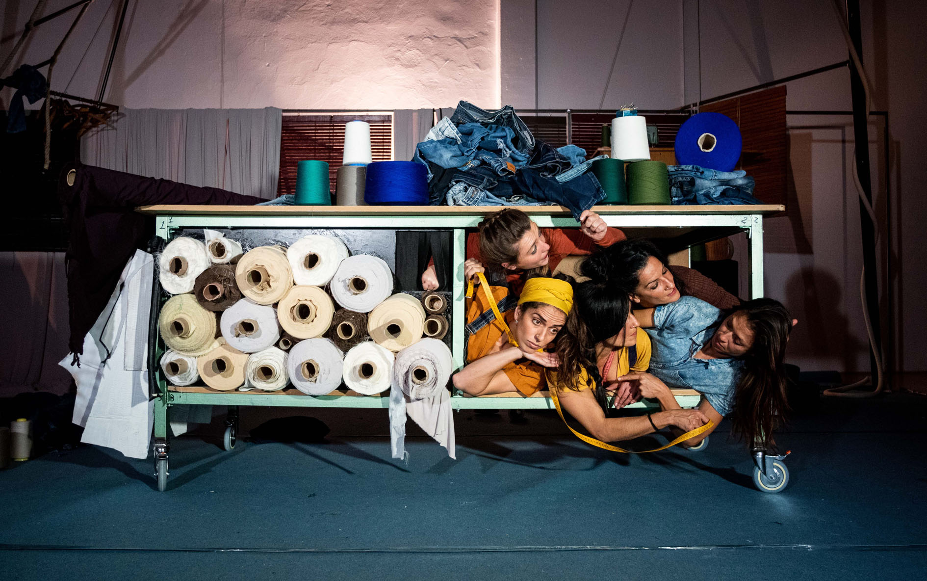 Una fábrica antigua, una máquina de coser, una escalera aérea, ropa reciclada, un mástil, bobinas de hilo, una cuerda y cinco mujeres acróbatas que cosen, bailan, ríen y trepan.