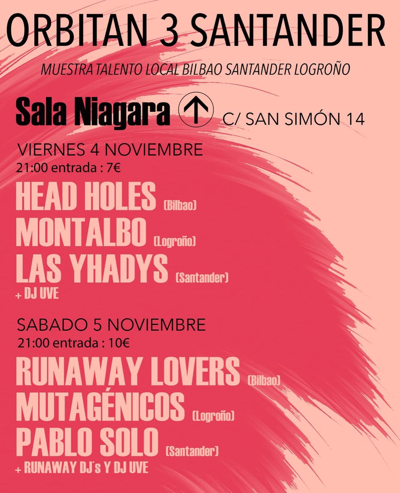 La sala Niágara de Santander acogerá, el viernes 4 y sábado 5 de noviembre, el Festival ‘Orbitan 3’ que incluirá seis bandas, tres de ellas emergentes y tres consolidadas, a las que acompañarán tres Djs como muestra del talento local de las ciudades de Santander, Bilbao y Logroño.