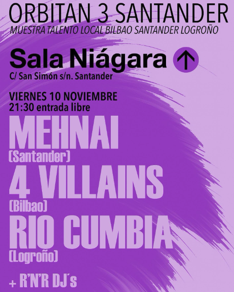 La segunda edición del festival “Orbitan 3” trae este viernes 10 de noviembre a las 21:30 horas a la sala Niágara las actuaciones de Mehnai, 4 Villains y Río Cumbia. Esta cita musical, reconocida en el programa cultural “Tan Cerca” que impulsan Santander, Bilbao y Logroño, apuesta por reivindicar el talento y la diversidad de la música local.