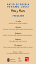Patio de Poesía pretende reunir una serie de lecturas poéticas de autores cántabros de diferentes generaciones que reciten sus poemas. Diferentes poetas, la mayoría de ellos cántabros o vinculados con nuestra comunidad autónoma, unirán sus voces para protagonizar un total de seis lecturas poéticas que comenzarán el 12 de julio y se prolongarán hasta el 23 de agosto.