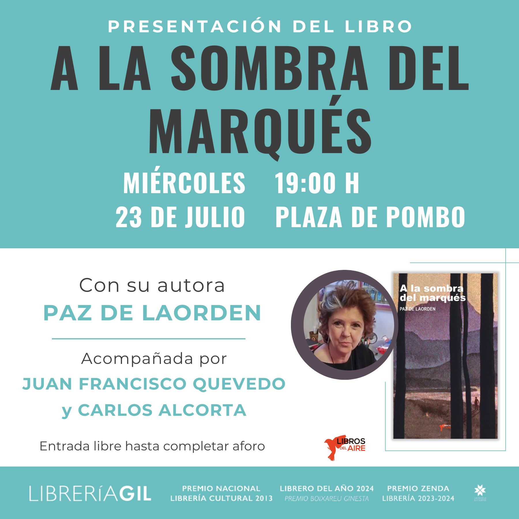 El miércoles 23 de julio, a las 19:00 h., la Librería Gil acoge la presentación de “A la sombra del Marqués”, de Paz de Laorden. La autora estará acompañada por Juan Francisco Quevedo y Carlos Alcorta. (Editorial Libros del Aire).