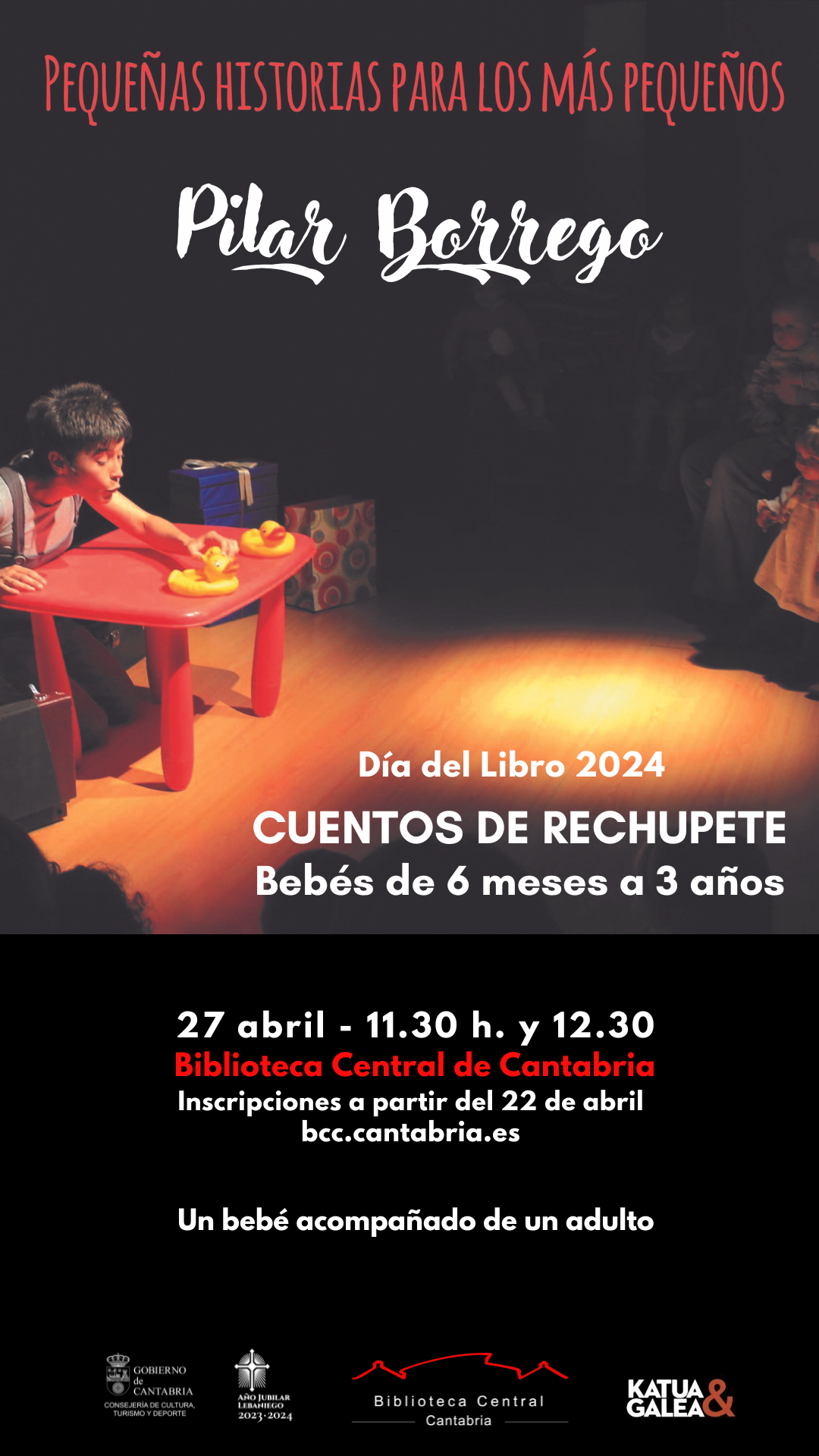 Sesión de cuentos para bebés de 6 meses a 3 años con Pilar Borrego en la Biblioteca Central de Cantabria el 27 de abril a las 11:30 y 12:30 horas.