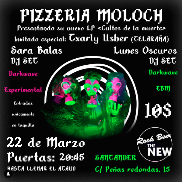 El sábado 22 de marzo en la sala Rock Beer The New, Pizzeria Moloch presenta su nuevo LP "Cultos de la Muerte", una propuesta estructurada en torno al postpunk, cargado de sonidos de reminiscencias industriales y esencia gótica.