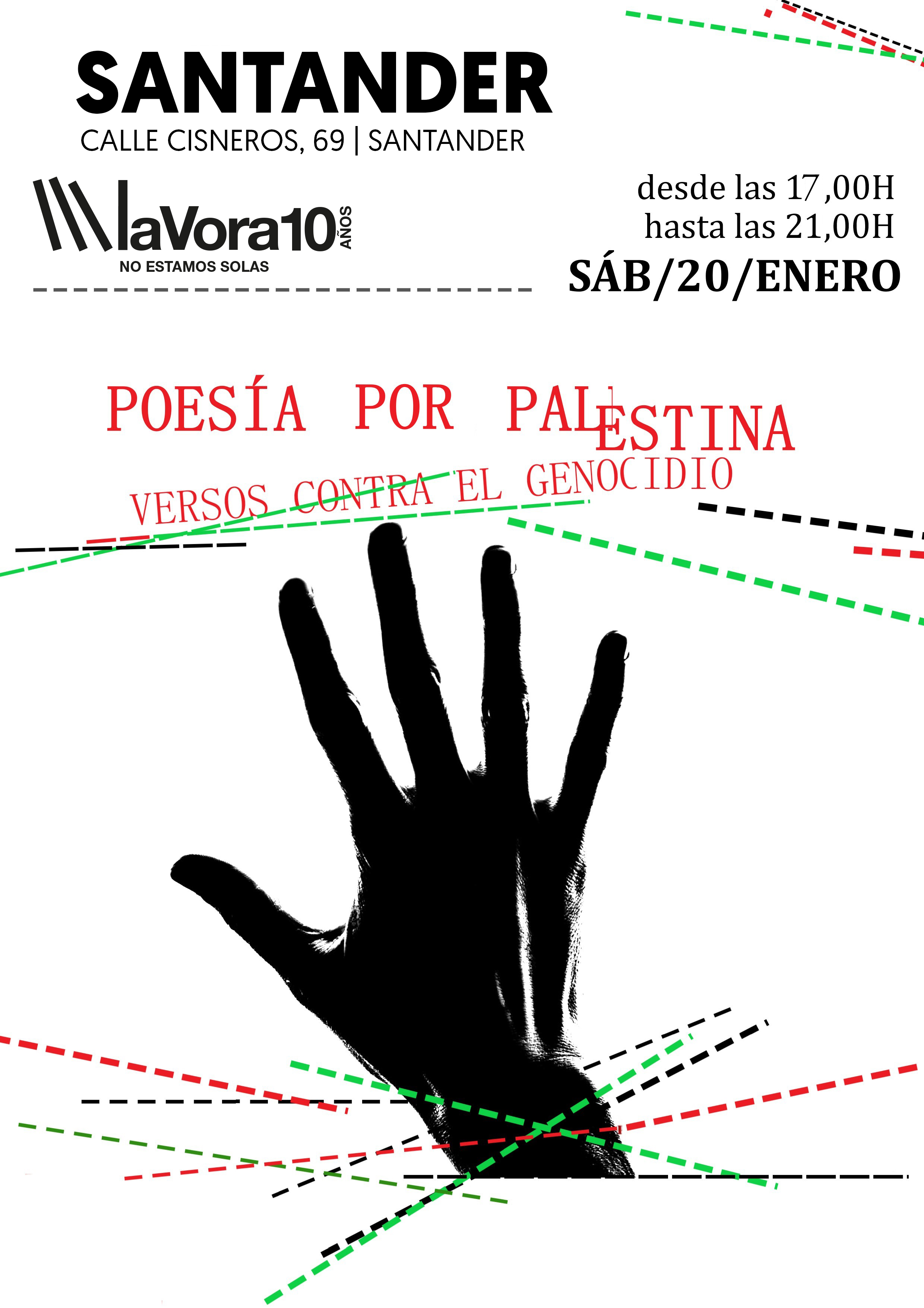 La Vorágine se une a la iniciativa simultánea que se celebrará el día 20 de enero en, al menos, 15 ciudades de España bajo el lema “Poesía por Palestina. Versos contra el genocidio”. El evento, que se celebrará entre las 17:00 y las 21:00 h contará con la participación de poetas de Cantabria, que podrán inscribirse hasta el 5 de enero en info@lavoragine.net .