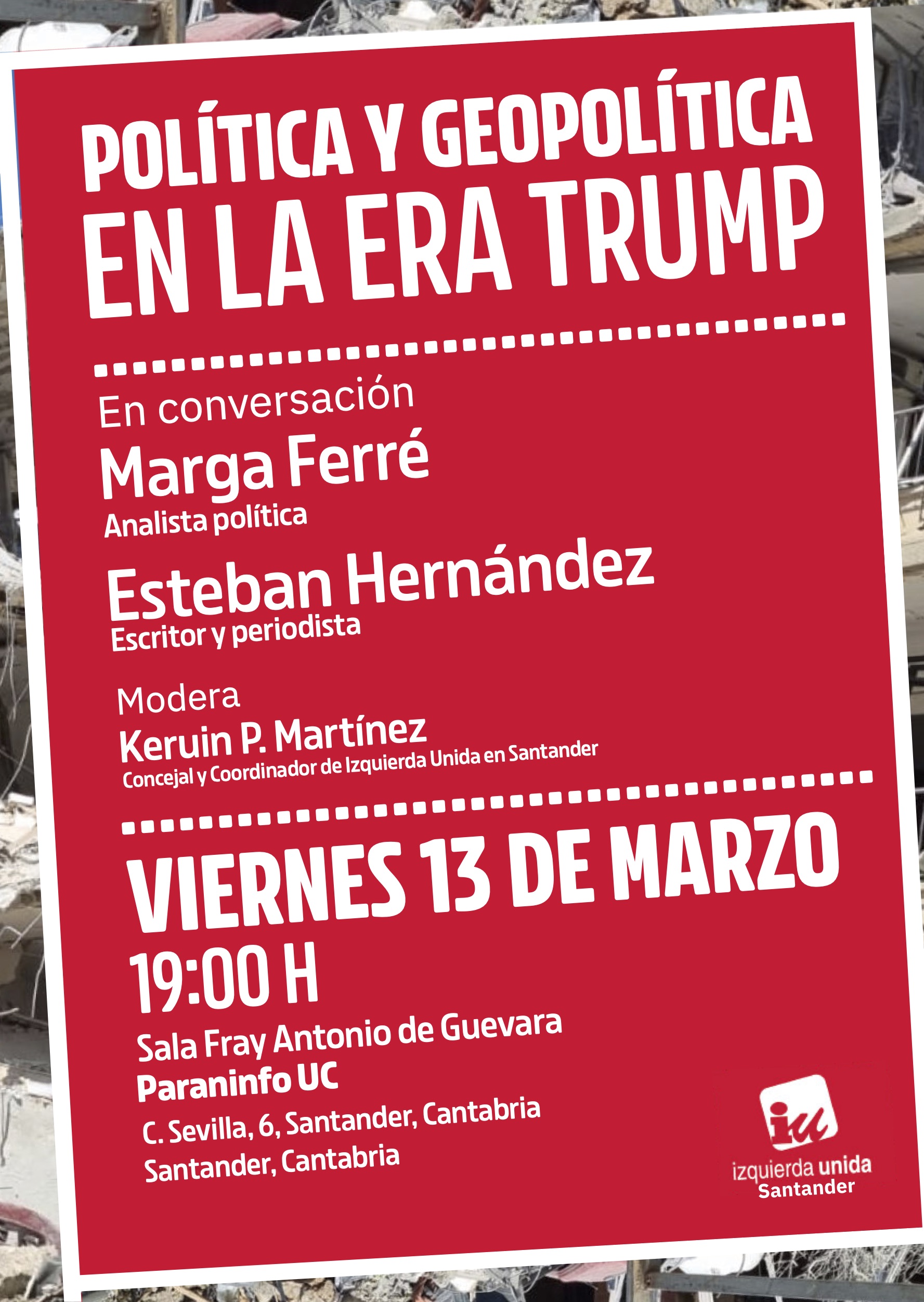 Contará con la presencia de la analista política Marga Ferré y del escritor y periodista Esteban Hernández. El debate estará moderado por Keruin P. Martínez, concejal y coordinador de Izquierda Unida en Santander.