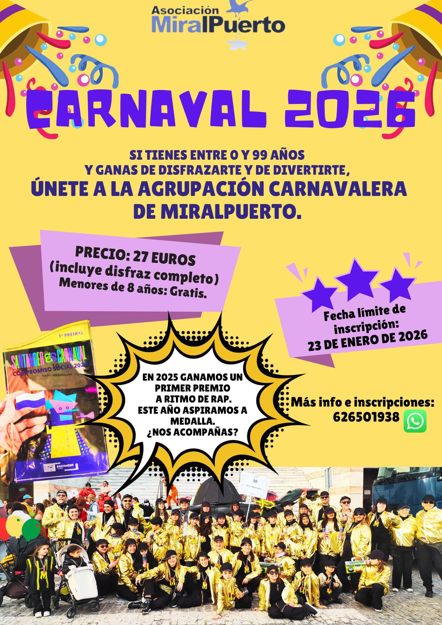 Pre-carnaval 2026 con la asociación de vecinos Miralpuerto el viernes 23 de enero 2026, de 17 a 20h en el local de la asociación: c/Juan de Santander (antigua Ruiz de Alda), 11 bis de Santander.