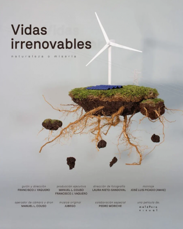 "Vidas irrenovables (Naturaleza o Miseria)" recorre España para recoger el testimonio de 47 personas que nos hablan de la "Transición Ecológica" y sus productos estrellas: "Las energías Renovables". Entre los protagonistas se encuentran personas afectadas como ganaderos, agricultores o vecinos que no quieren ver "machacados" sus pueblos por esta invasión hasta científicos de primer nivel como Antonio Turiel o Francisco Varela (ambos del CSIC).