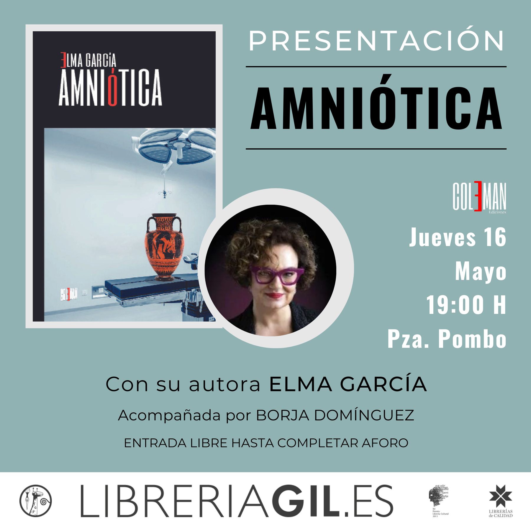 El jueves 16 de mayo, a las 19:00 h. la lIbrería GIl de la Plaza de Pombo acoge la presentación de “Amniótica”, de Elma García. La autora estará acompañada por Borja Domínguez. (Editorial Coleman).