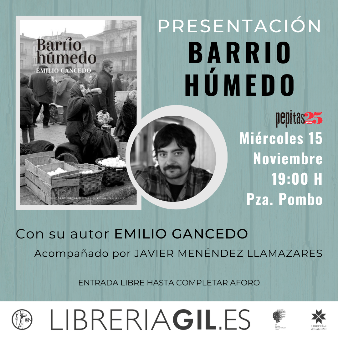 El miércoles 15 de noviembre, a las 19:00 h. la Librería Gil acoge la presentación de “Barrio Húmedo”, de Emilio Gancedo (Editorial Los Aciertos y Pepitas). El autor estará acompañado por Javier Menéndez Llamazares.