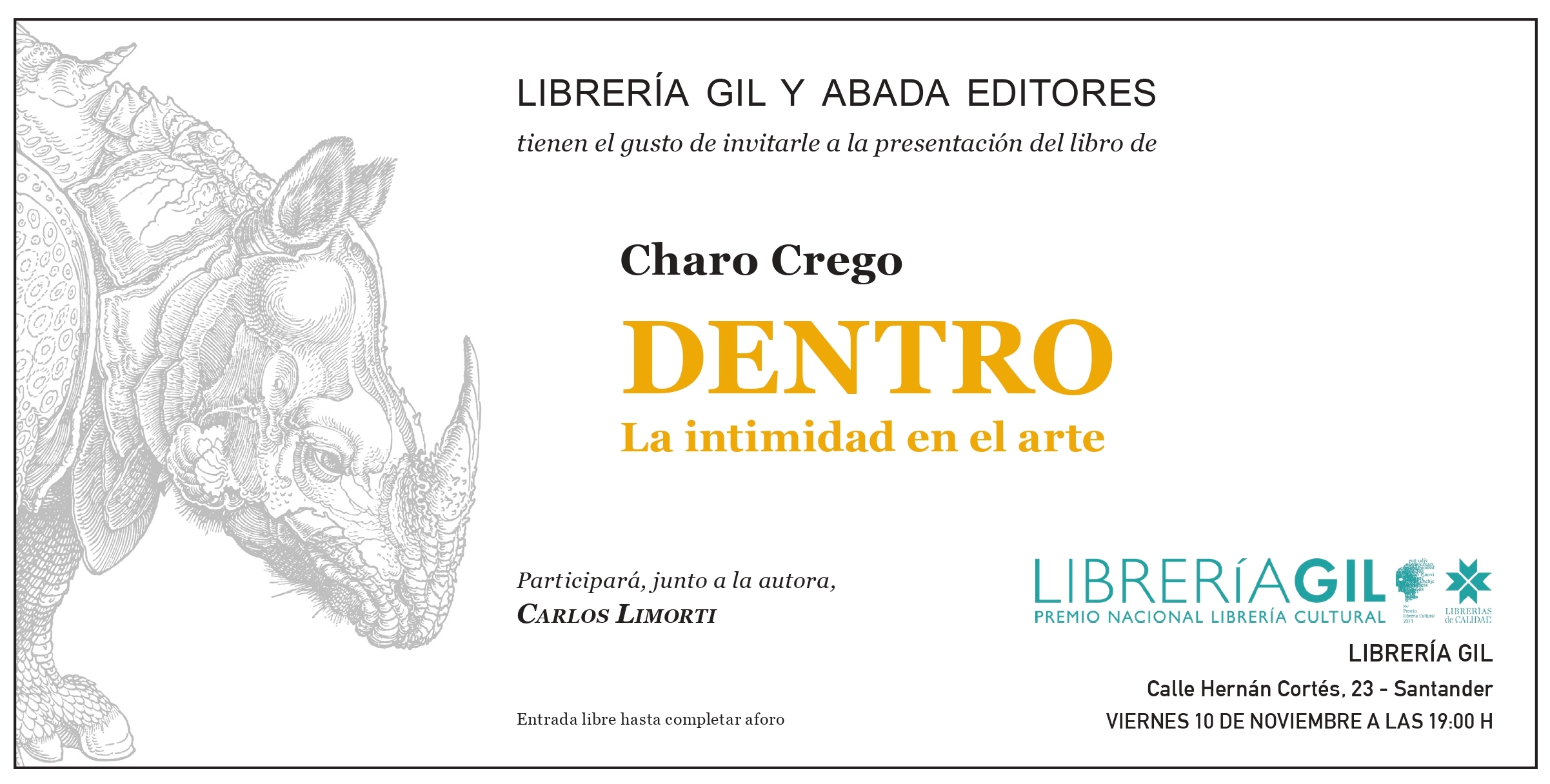El viernes 10 de noviembre, a las 19:00 h. tendrá lugar en Librería Gil la presentación de “Dentro. La intimidad en el arte”, de Charo Crego (Editorial Abada). La autora estará acompañada por Carlos Limorti.