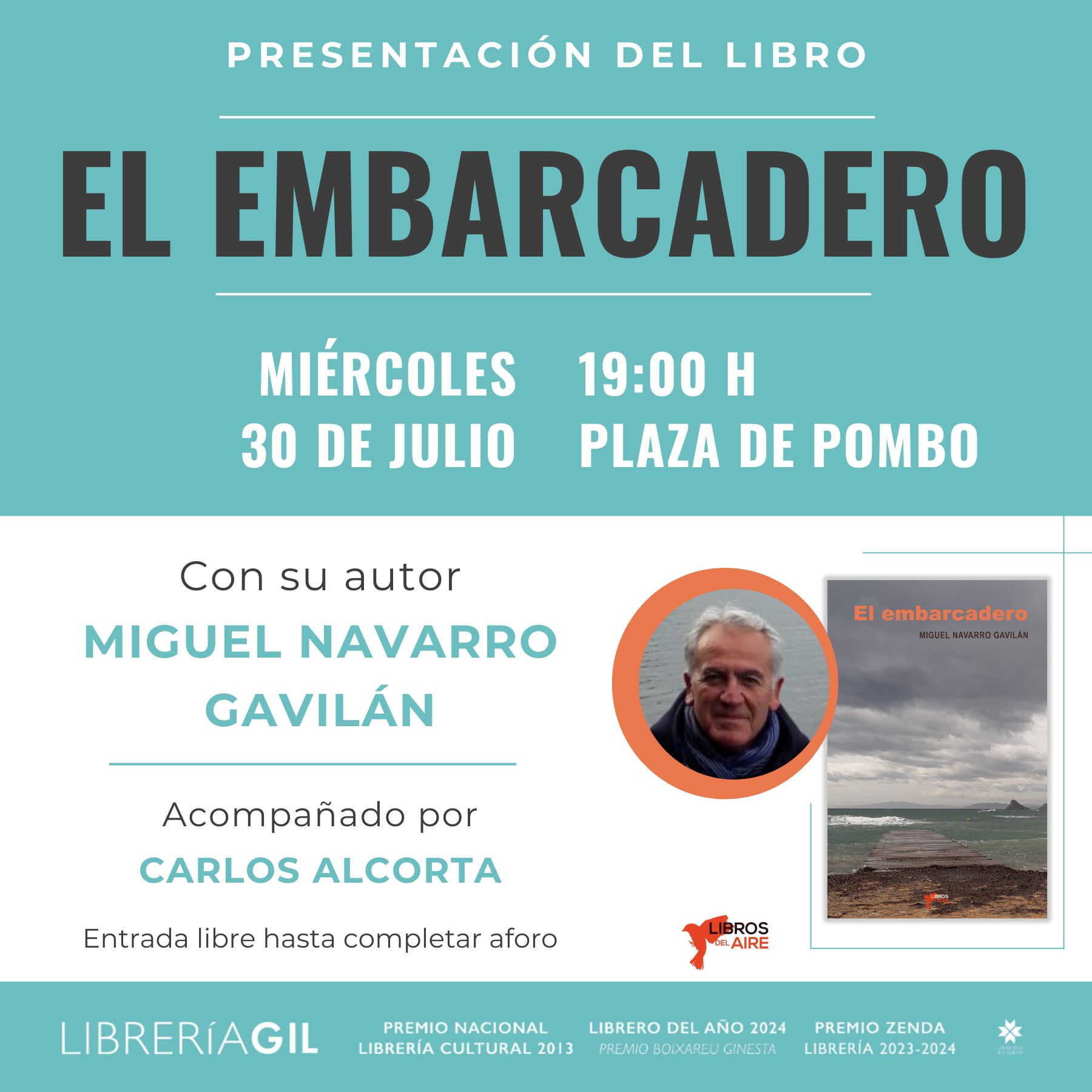 El miércoles, 30 de julio, a las 19:00 h. tendrá lugar en Gil la presentación de “El embarcadero”, de Miguel Navarro Gavilán. El autor estará acompañado por Carlos Alcorta. (Editorial Libros del Aire).