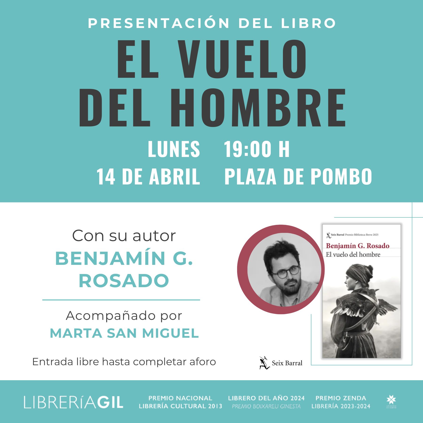 El lunes 14 de abril, la Librería Gil acoge la presentación del libro “El vuelo del hombre ”, de Benjamin G. Rosado. El autor estará acompañado por Marta San Miguel.