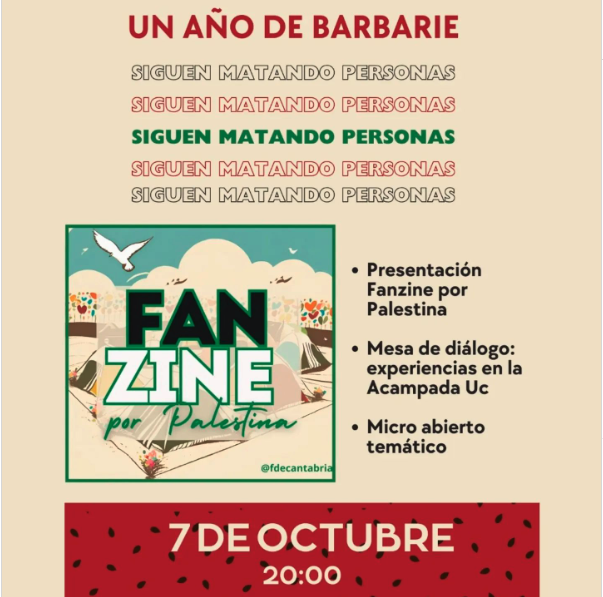 El Centro Social Smolny acoge la jornada “Un año de barbarie”, que incluye la presentación de “Fanzine por Palestina”. Además, se celebrará una mesa de diálogo en la que se compartirán las experiencias de la acampada en la UC y habrá un micro abierto temático.