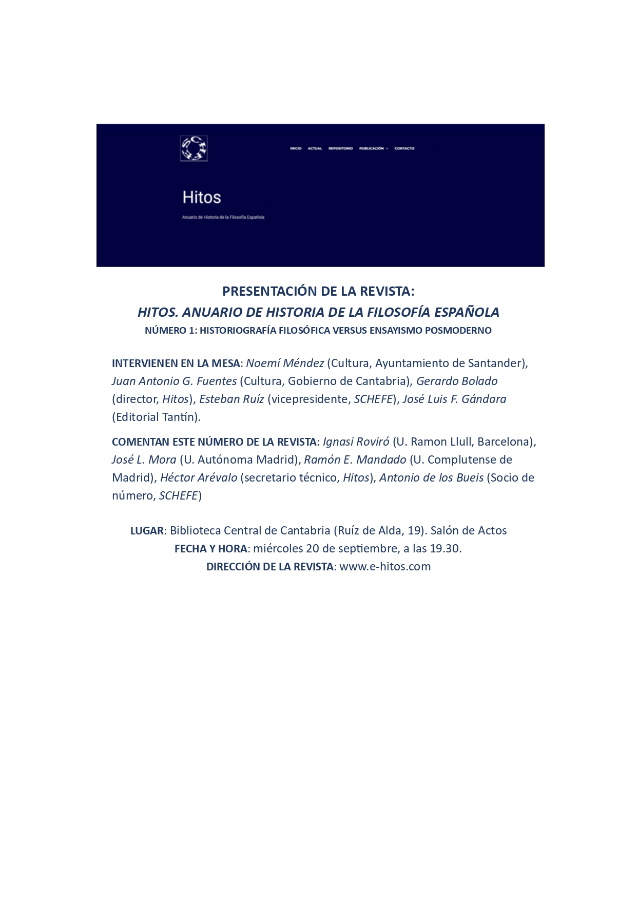 Además, están previstas las intervenciones de los participantes en este primer número: Ignasi Roviró (Universidad Ramon LLul, Barcelona), José L. Mora (Universidad Autónoma, Madrid), Ramón E. Mandado (Universidad Complutense, Madrid), Héctor Arévalo (secretario de Hitos) y Antonio de los Bueis (socio de número de la Sociedad Cántabra de Historiadores de la Filosofía Española).