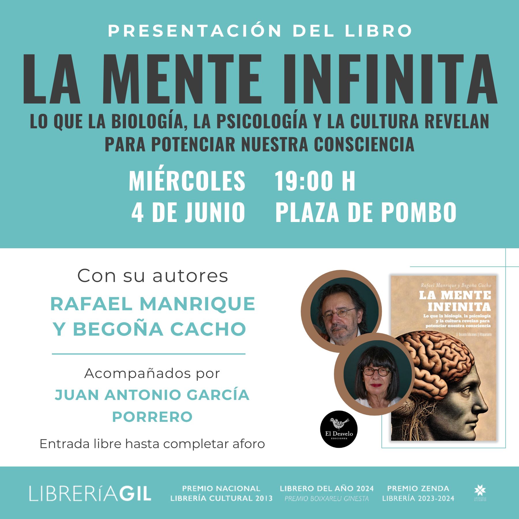 El miércoles 4 de junio, a las 19:00 h. tendrá lugar la presentación de “La mente infinita”, de Rafael Manrique y Begoña Cacho. Los autores estarán acompañados por Juan Antonio García Porrero. El Desvelo Ediciones.