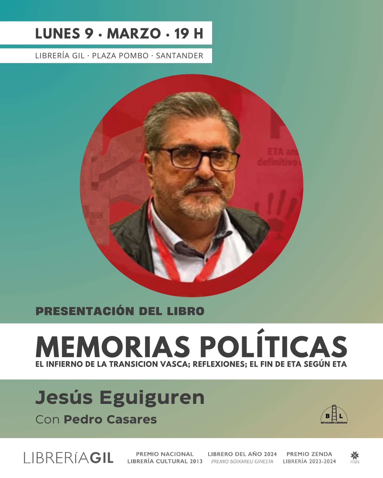 El lunes 9 de marzo a las 19:00h la Librería Gil acoge la presentación de “Memorias políticas”, de Jesús Eguiguren. El autor estará acompañado por Pedro Casares.