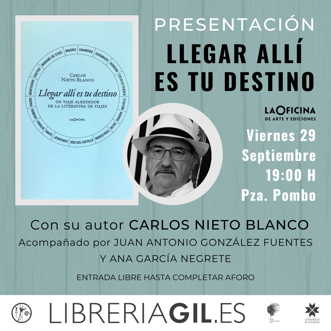 El viernes 29 de septiembre, a las 19:00 h. la Librería Gil acoge la presentación de “Llegar allí es tu destino”, de Carlos Nieto Blanco. El autor estará acompañado por Juan Antonio González Fuentes y Ana García Negrete.