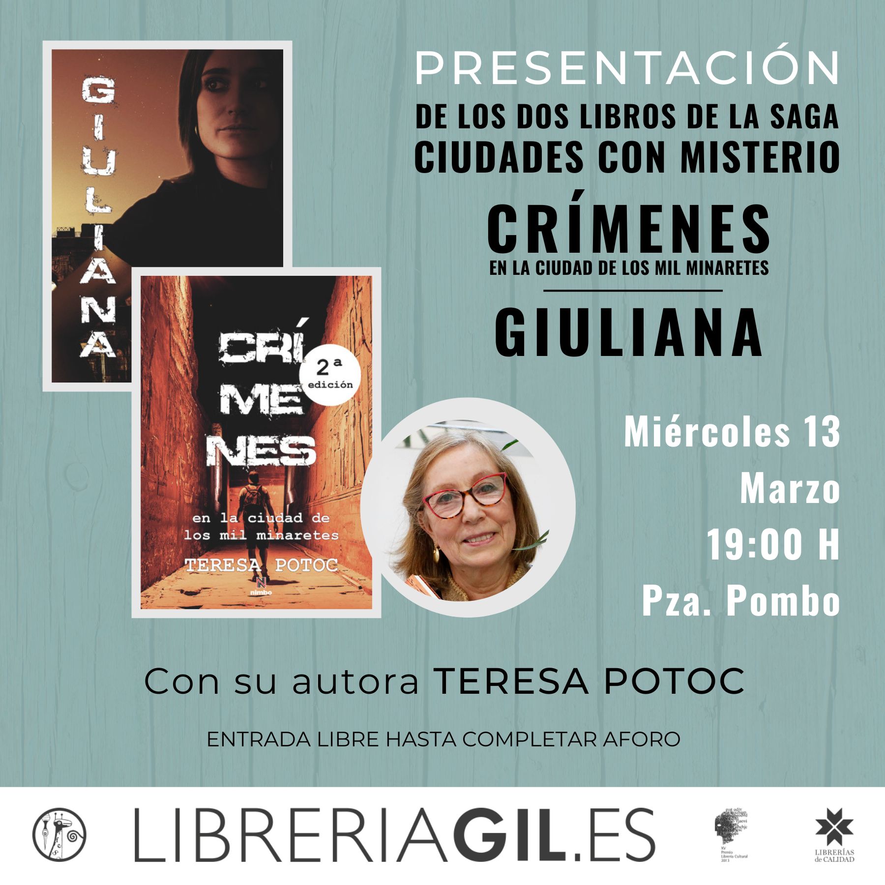 El miércoles 13 de marzo, a las 19:00 h. la Librería Gil acoge la presentación de “Crímenes en la ciudad de los Mil Minaretes” y “Giuliana”, los dos libros de la saga “Ciudades con Misterio”, de Teresa Potoc.