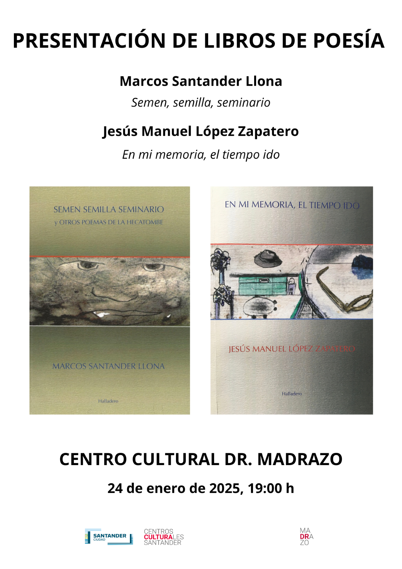 El viernes 24 de enero, a las 19:00 h, tendrá lugar la presentación de dos libros de poesía a cargo de sus autores. Se trata de «En mi memoria, el tiempo ido», de José Manuel López Zapatero y «Semen, semilla, seminario», de Marcos Santander Llona.