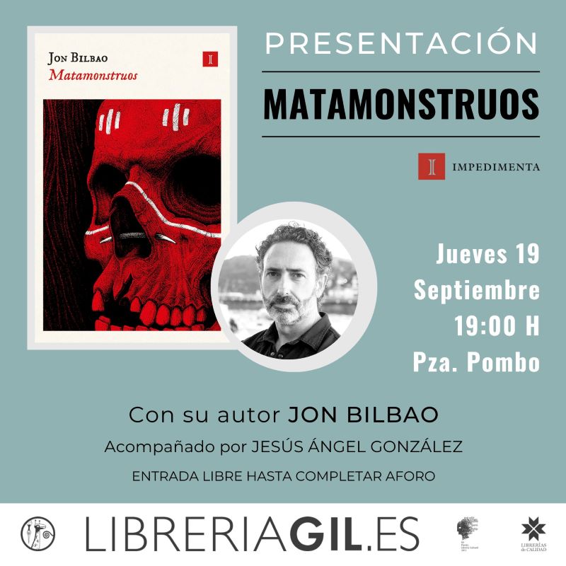 El jueves 19 de septiembre, a las 19:00 h. , la Librería Gil de la Plaza de Pombo acoge la presentación de “Matamonstruos”, de Jon Bilbao. El autor estará acompañado por Jesús Ángel González (Editorial Impedimenta).