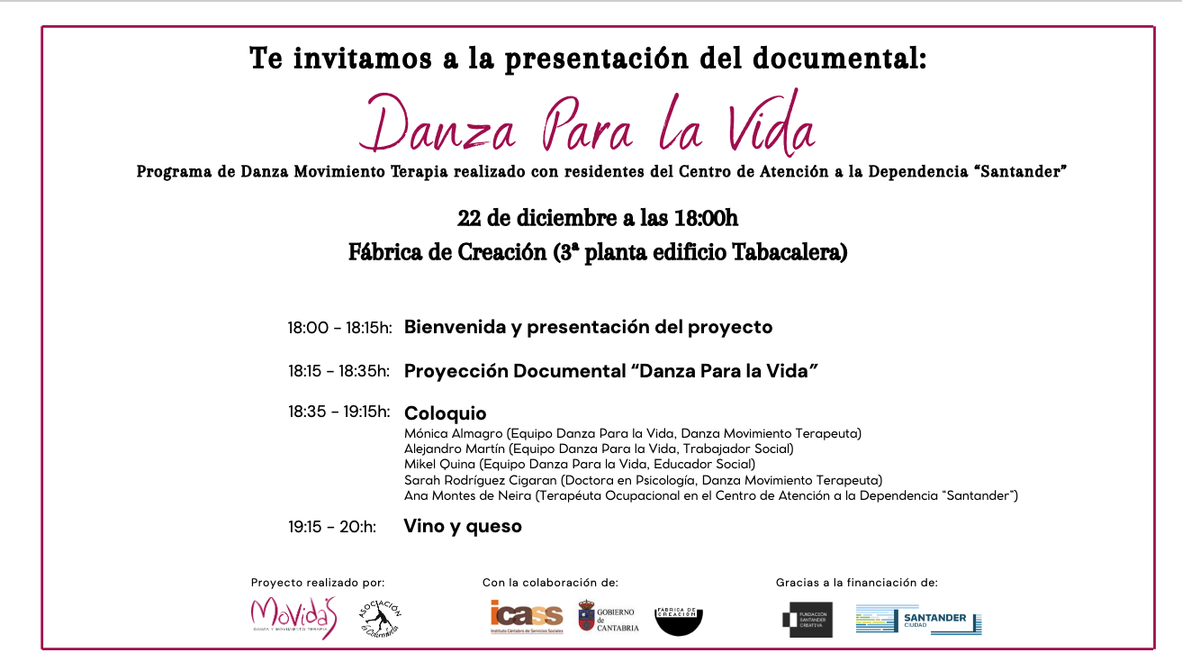 La Fábrica de Creación acoge la presentación del documental "Danza para la vida", un programa de Danza Movimiento Terapia realizado con residentes del Centro de Atención a la Dependencia Santander.