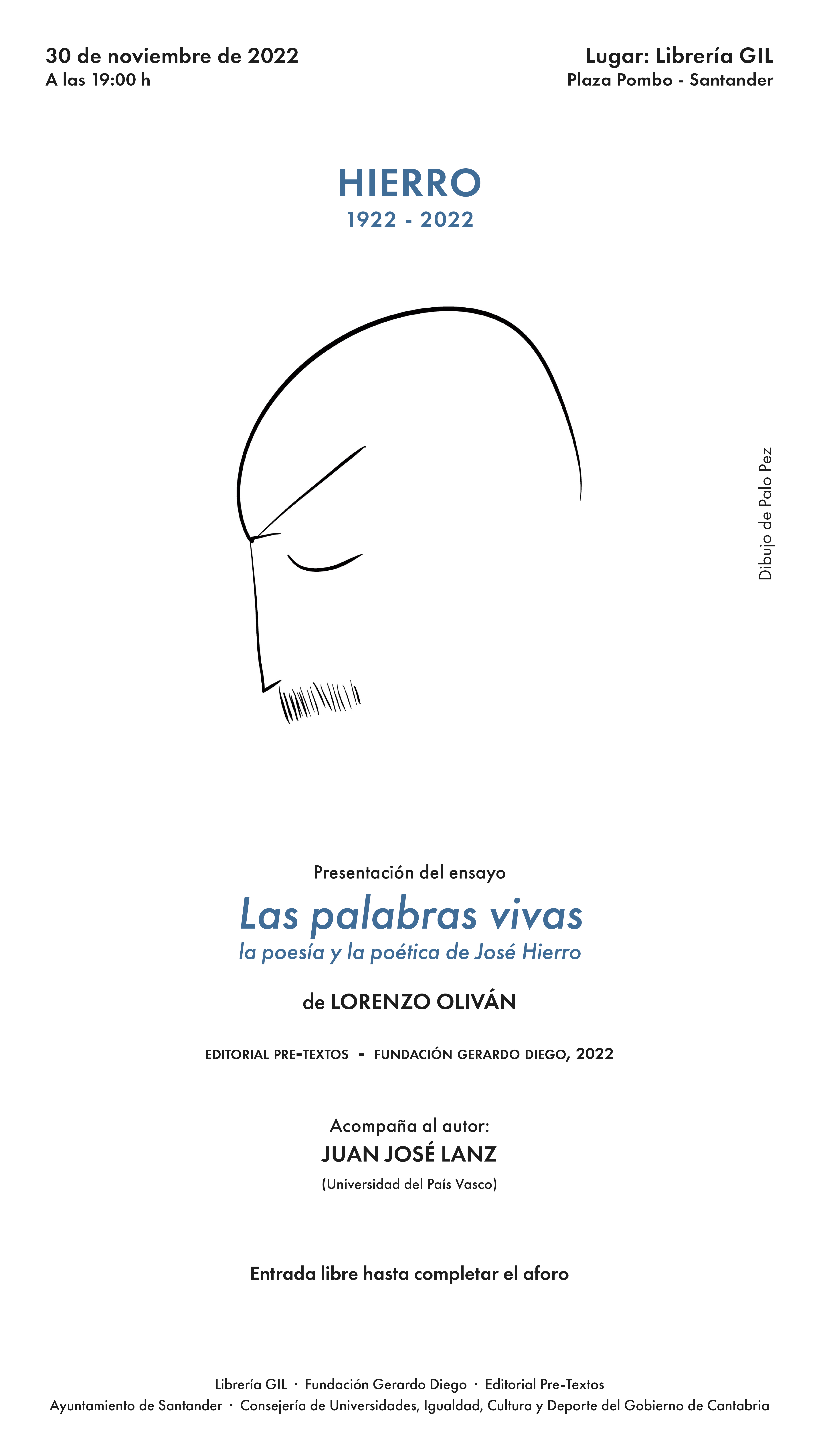 La Librería Gil acoge la presentación del ensayo “Las palabras vivas: la poesía y la poética de José Hierro”, de Lorenzo Oliván, coeditado por la Fundación Gerardo Diego y la editorial Pre-Textos en 2022. El autor estará acompañado por Juan José Lanz.