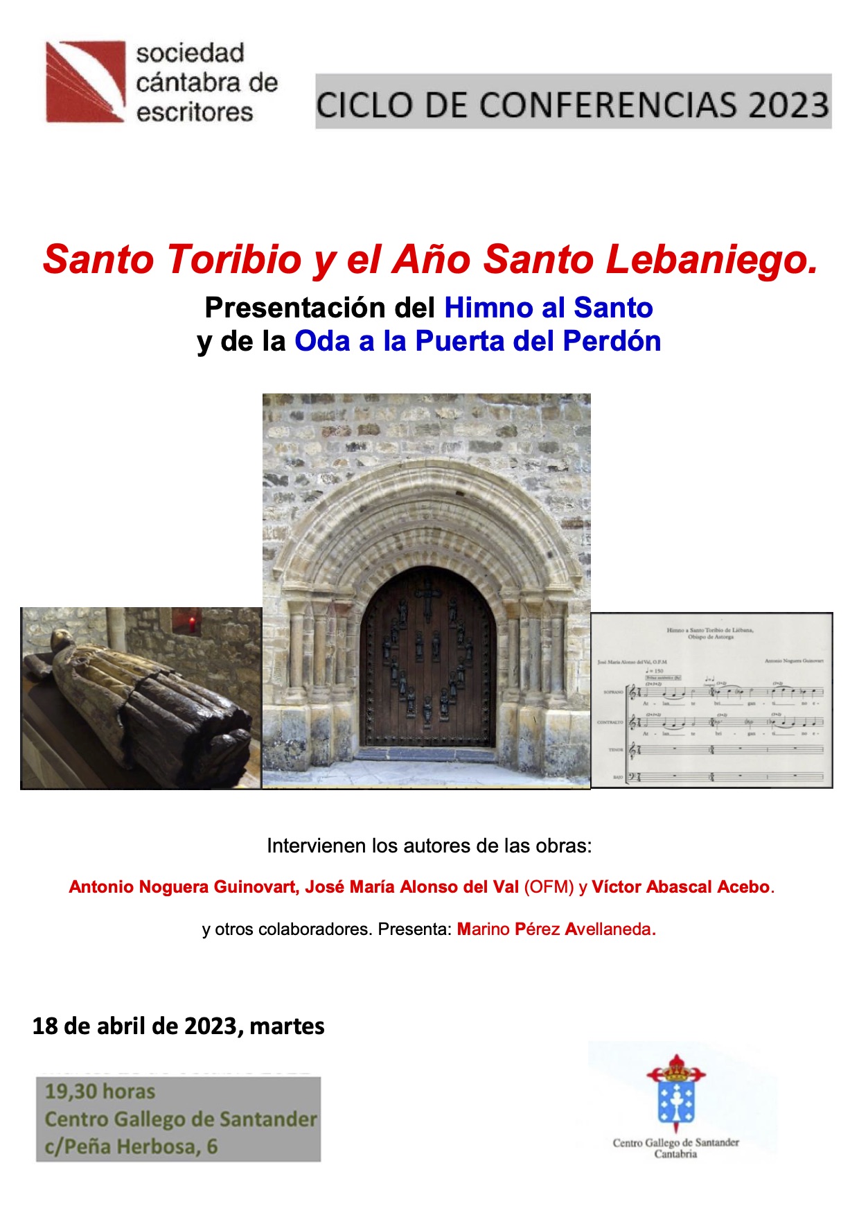El martes 18 de abril, dentro del Ciclo de Conferencias de la Sociedad Cántabra de Escritores, tendrá lugar a las 19,30 horas en el Centro Gallego de Santander (C/ Peña Herbosa, 6) un acto de presentación del “Himno a Santo Toribio de Liébana” y de la” Oda a la Puerta del Perdón”, en el que intervendrán los creadores de las obras: el compositor musical Antonio Noguera, profesor del Conservatorio Ataúlfo Argenta de Santander, y los escritores José María Alonso del Val, franciscano, y Víctor Abascal Acebo, miembro de la SCE.