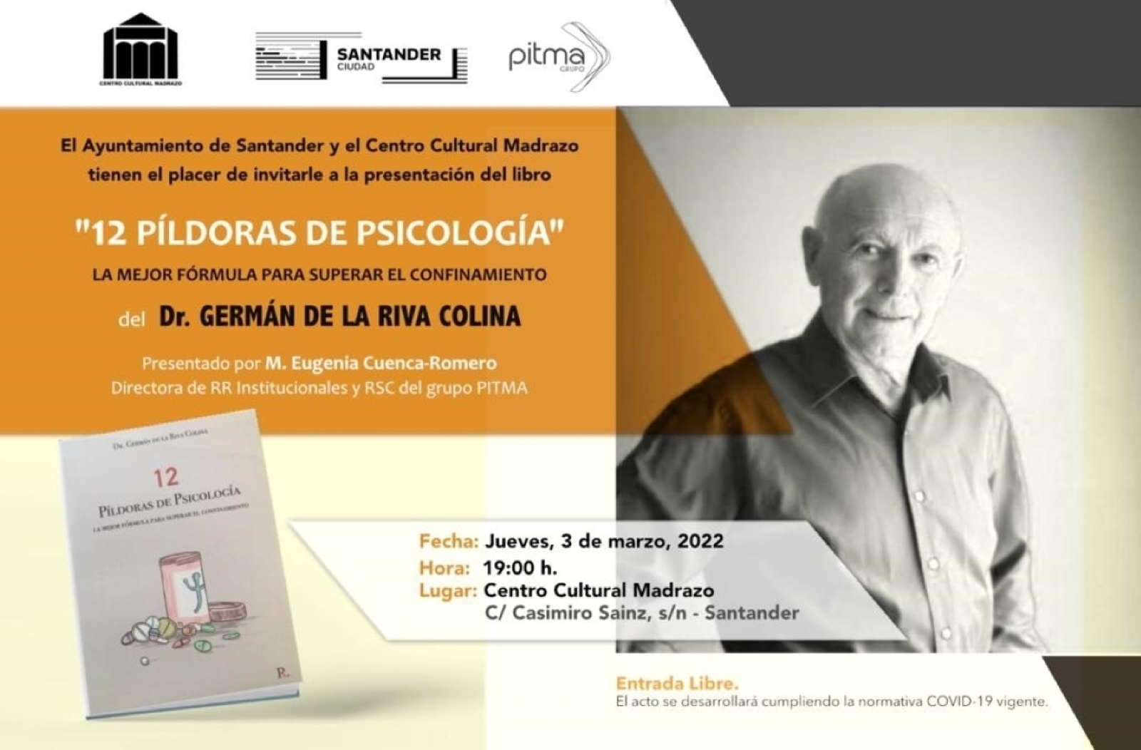 El Centro Cultural Doctor Madrazo acoge la presentación del libro de Germán de la Riva titulado “12 píldoras de Psicología”. El acto contará con las intervenciones del propio autor y de Maria Eugenia Cuenca-Romero Navarro, Directora de Relaciones Institucionales del Grupo PITMA.