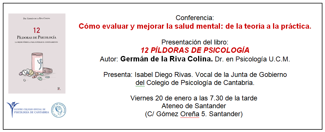 El Ateneo de Santander acoge la presentación del libro “12 píldoras de psicología”, de Germán de la Riva Colina, doctor en Psicología por la UCM. El autor pronunciará la conferencia titulada “Cómo evaluar y mejorar la salud mental: de la teoría a práctica”.