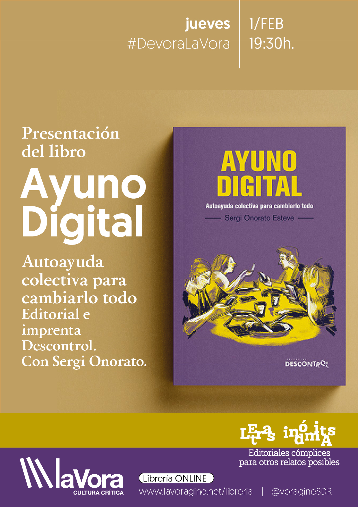 Sergi Onorato estará en La Vorágine en un doble encuentro de Letras Indómitas. Por una parte presentará su libro “Ayuno Digital” pero también hablará acerca de la editorial Descontrol, un proyecto que nació a raíz de las luchas estudiantiles del 2009 y que en 2015, después de muchos años aprendiendo el oficio de Artes Gráficas, lanzaron su sello editorial. Desde entonces no han parado de publicar títulos tan interesantes como el que se presenta en esta ocasión.