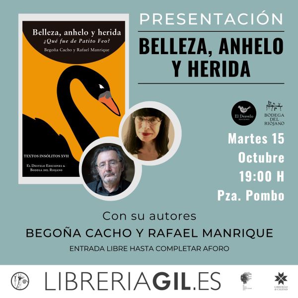 El martes 15 de octubre, a las 19:00 h. Librería Gil de la Plaza de Pombo presentación de “Belleza, anhelo y herida. ¿Qué fue de Patito Feo?”, de Begoña Cacho y Rafael Manrique (El Desvelo ediciones y Bodega El Riojano).
