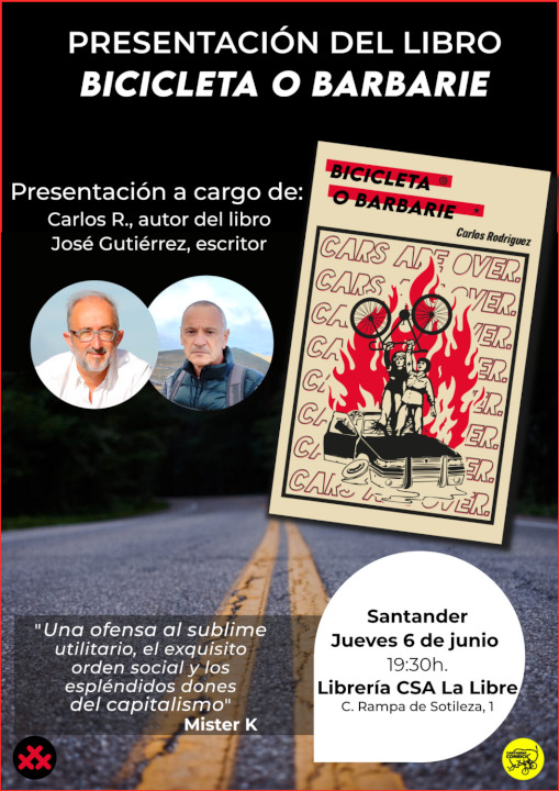 El jueves 6 de junio Carlos Rodríguez González presenta en La Libre su libro “Bicicleta o barbarie”, con la compañía del escritor José Gutiérrez.