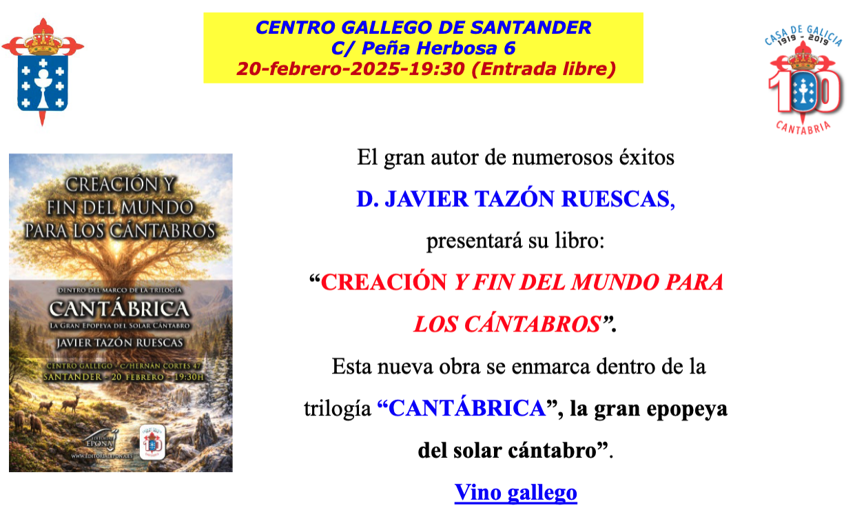 El Centro Gallego de Santander acoge la presentación del libro "Creación y fin del mundo para los cántabros", de Javier Tazón Ruescas.