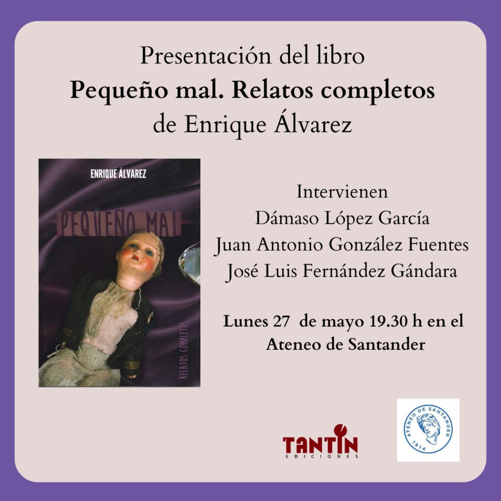 Enrique Álvarez presenta en el Ateneo de Santander su libro de relatos “Pequeño mal”. El acto contará con la participación de Dámaso López Garcia, Juan Antonio González Fuentes y Jose Luis Fernández Gándara (Ed. Tantín).