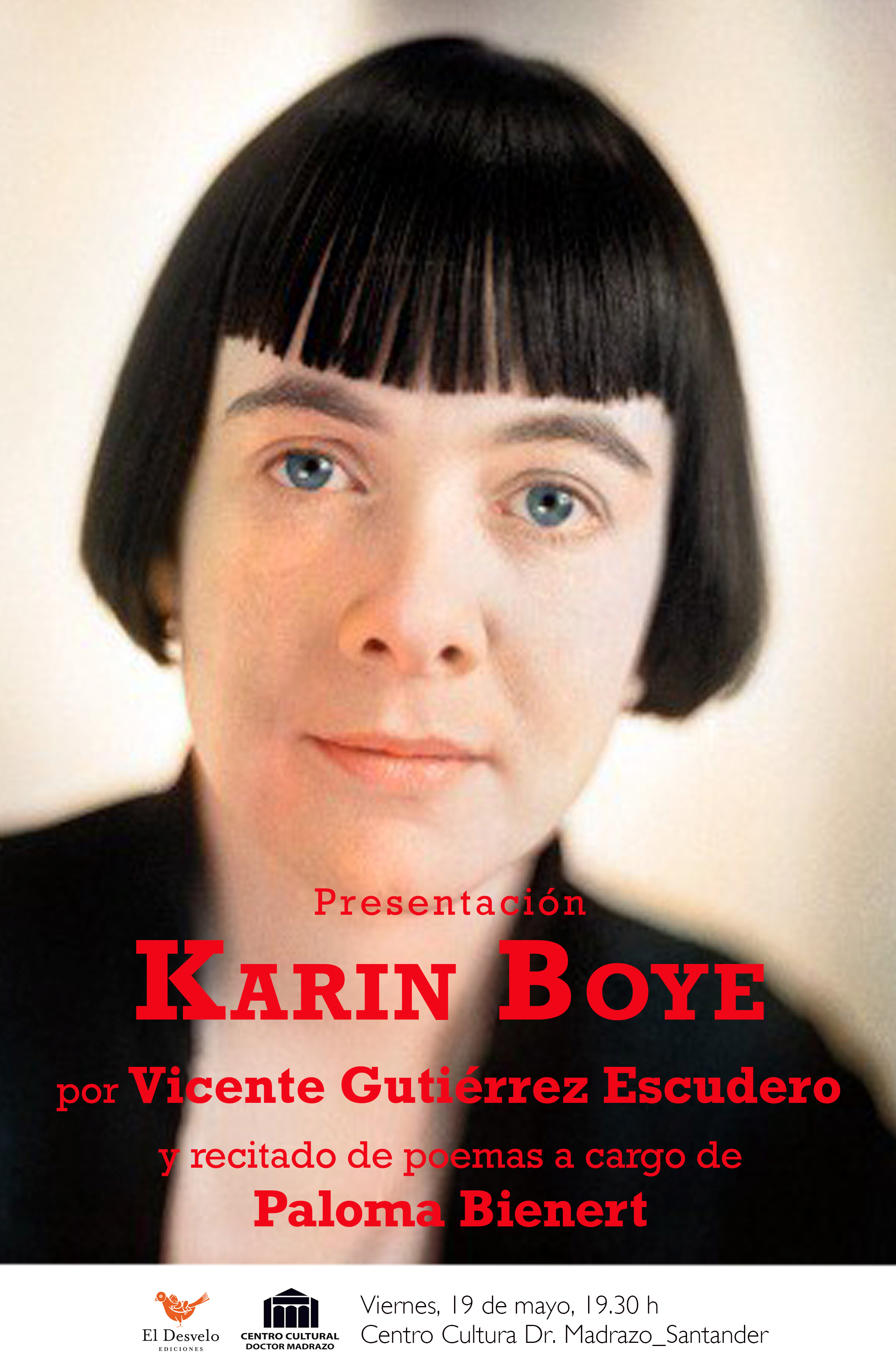 El Centro Cultural Dr. Madrazo acogerá el viernes, 19 de mayo, a las 19.30 horas, la presentación de un libro de poesía de la escritora sueca Karin Boye (1900-1941), así como la lectura de una selección de sus poemas. La primera correrá a cargo del poeta Vicente Gutiérrez Escudero y la segunda, de la también poeta Paloma Bienert.