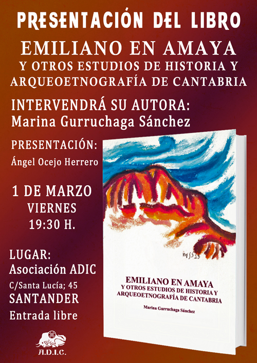 La sede de la Asociación para la Defensa de los Intereses de Cantabria (ADIC) en Santander acoge el viernes 1 de marzo la presentación del libro “Emiliano en Amaya y otros estudios de Historia y Arqueoetnografía de Cantabria”, con una charla a cargo de su autora, la historiadora Marina Gurruchaga Sánchez.