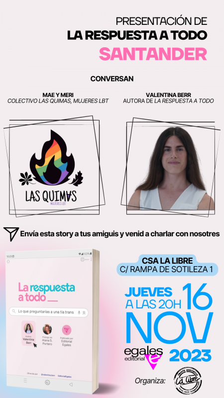 Imagina que estás en un cumpleaños. Hay gente que no conoces y te toca sentarte al lado de una chica. Y que esa chica es trans. Este es un libro para saciar la curiosidad que responde a toda clase de preguntas sobre las mujeres trans de forma cercana pero muy directa. De esa forma uno puede empezar a tener conversaciones más… interesantes. El libro abre con el prólogo de Alana S. Portero, fenómeno internacional.