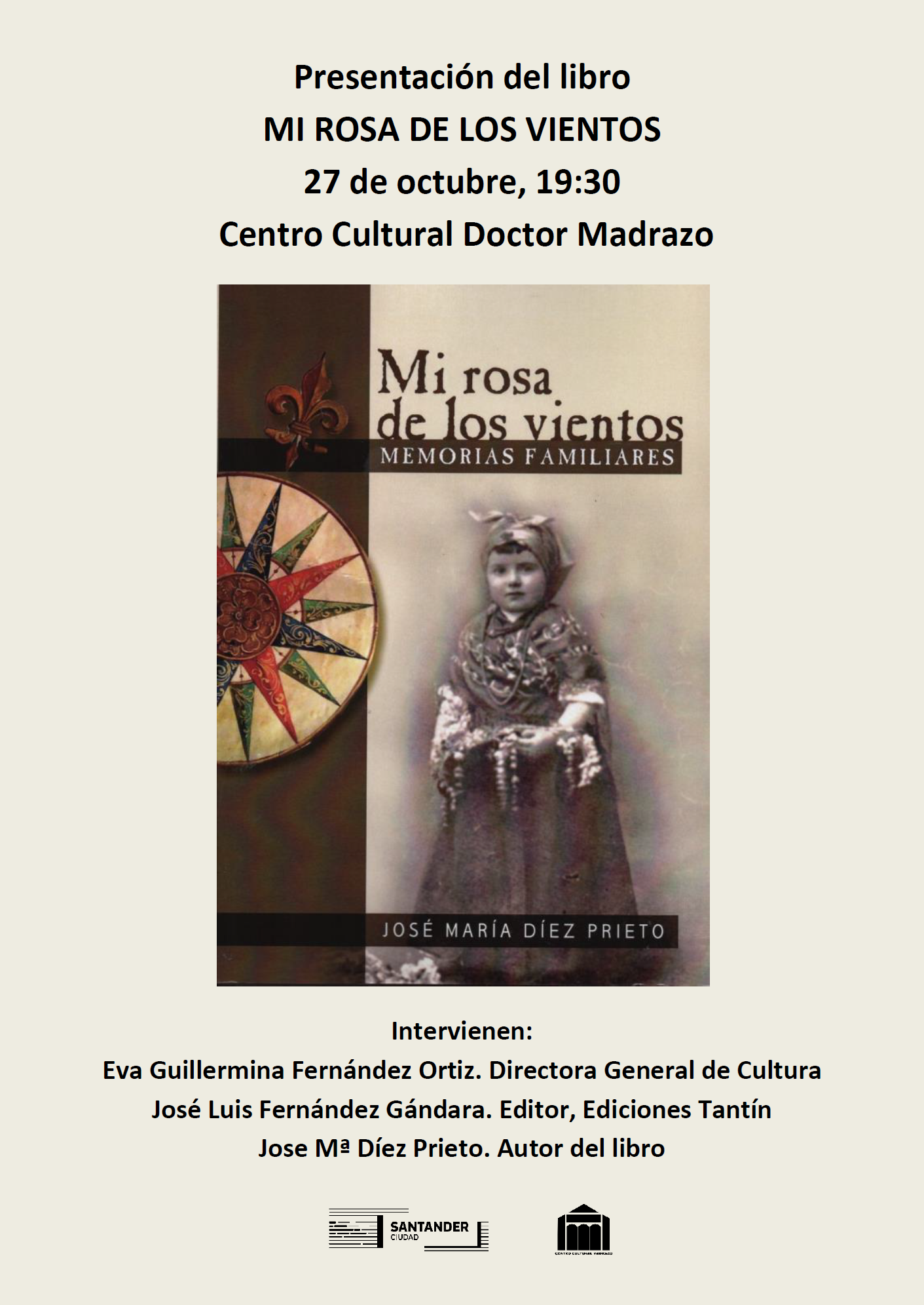 El jueves 27 de octubre, a las 19:30h, tendrá lugar en el Centro Cultural Doctor Madrazo, la presentación del libro Mi rosa de los vientos de José Mª Díez Prieto. Intervienen en el acto Eva Guillermina Fernández, Directora General de Cultura del Ayuntamiento de Santander, José Luis Fernández Gándara, de Ediciones Tantín y José Mª Díez Prieto, autor del libro.