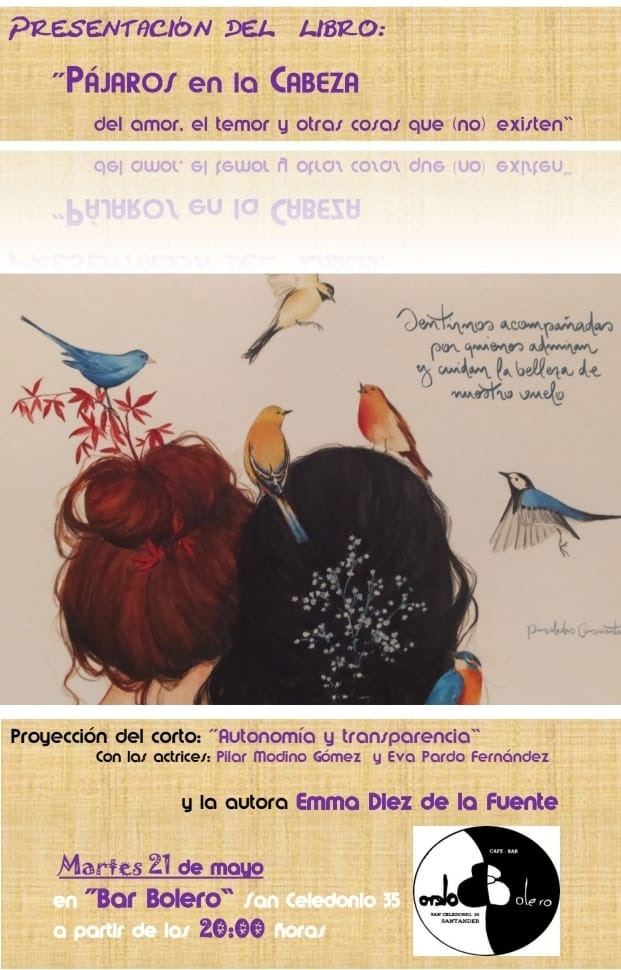 El Café/ Bar Bolero acoge la presentación del libro “Pájaros en la cabeza”, de Ema Diez de la Fuente. Además se proyectará el corto “Autonomía y transparencia”, con las actrices Pilar Modino Gómez y Eva Pardo Fernández.
