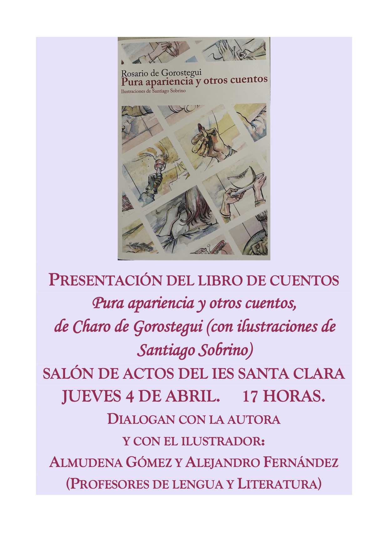 El Salón de Actos del IES Santa Clara acoge la presentación del libro de cuentos “Pura apariencia y otros cuentos”, de Rosario de Gorostegui, ilustrado por Santiago Sobrino.
