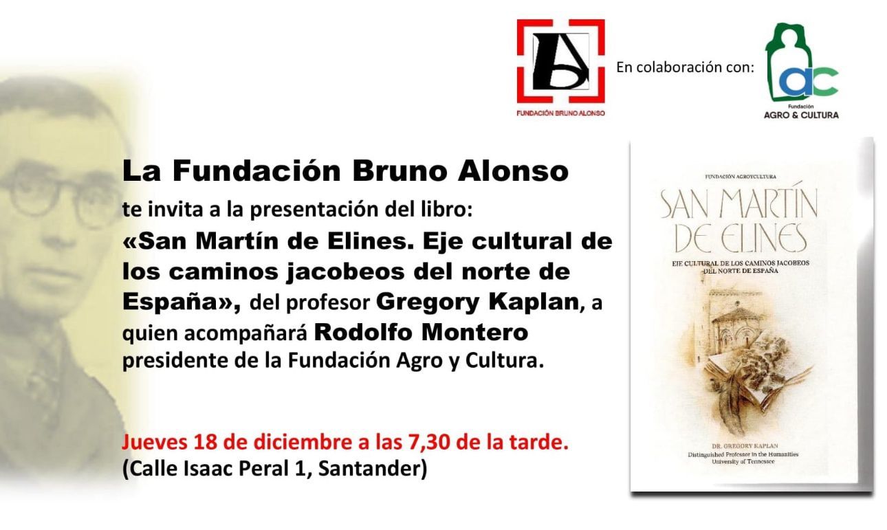 La Fundación Bruno Alonso organiza la presentación del libro "San Martín de Elines. Eje cultural de los caminos jacobeos del norte de España", del profesor Gregory Kaplan, a quien acompañará Rodolfo Montero, presidente de la Fundación Agro y Cultura.