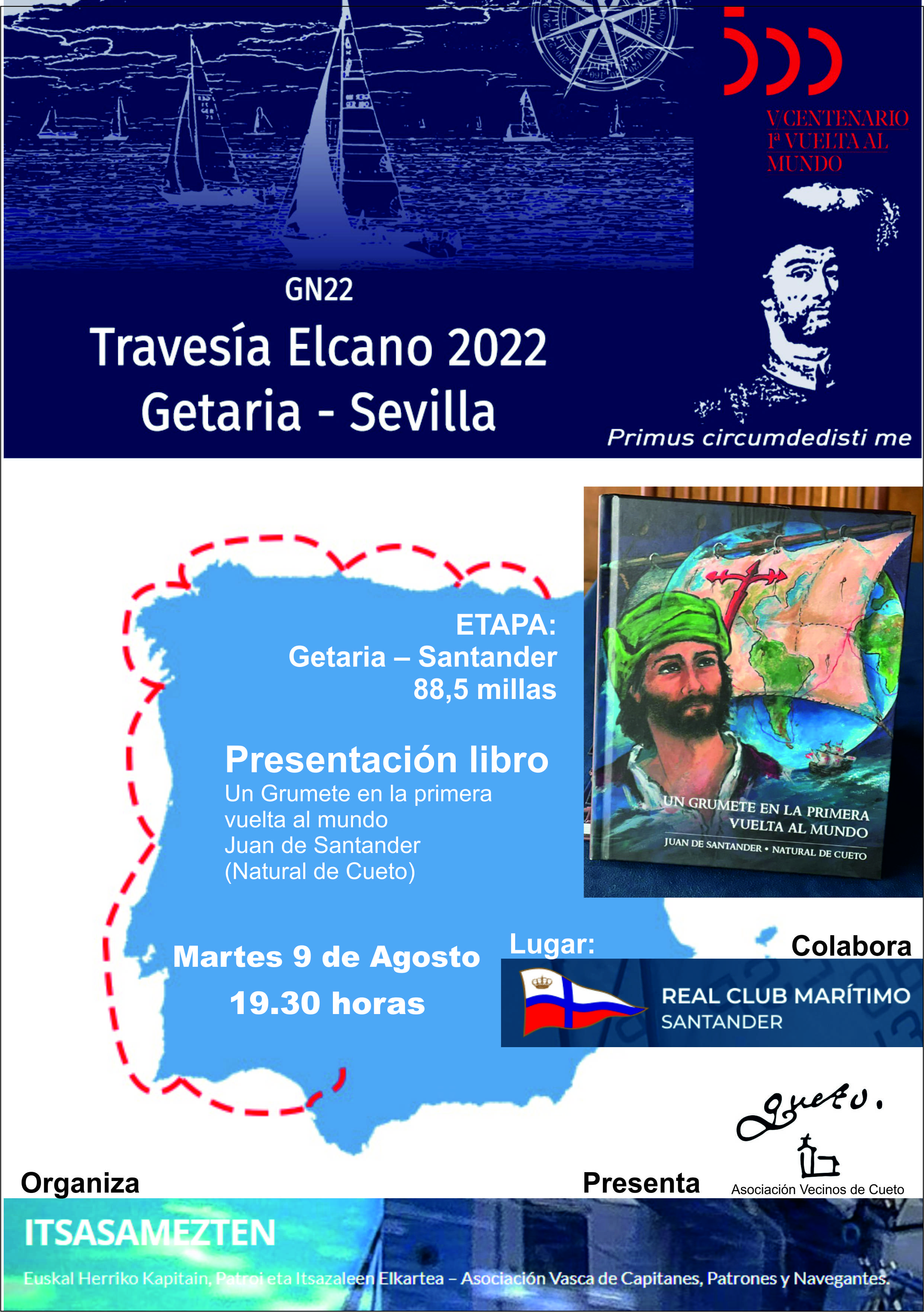 Coincidiendo con la llegada a la Bahía de Santander de la regata “Travesía Elcano 2022, Guetaria-Sevilla”, con motivo del V Centenario de la primera vuelta al mundo, la Asociación de Vecinos de Cueto, presentará el libro "Un grumete en la primera Vuelta al mundo-Juan de Santander natural de Cueto".