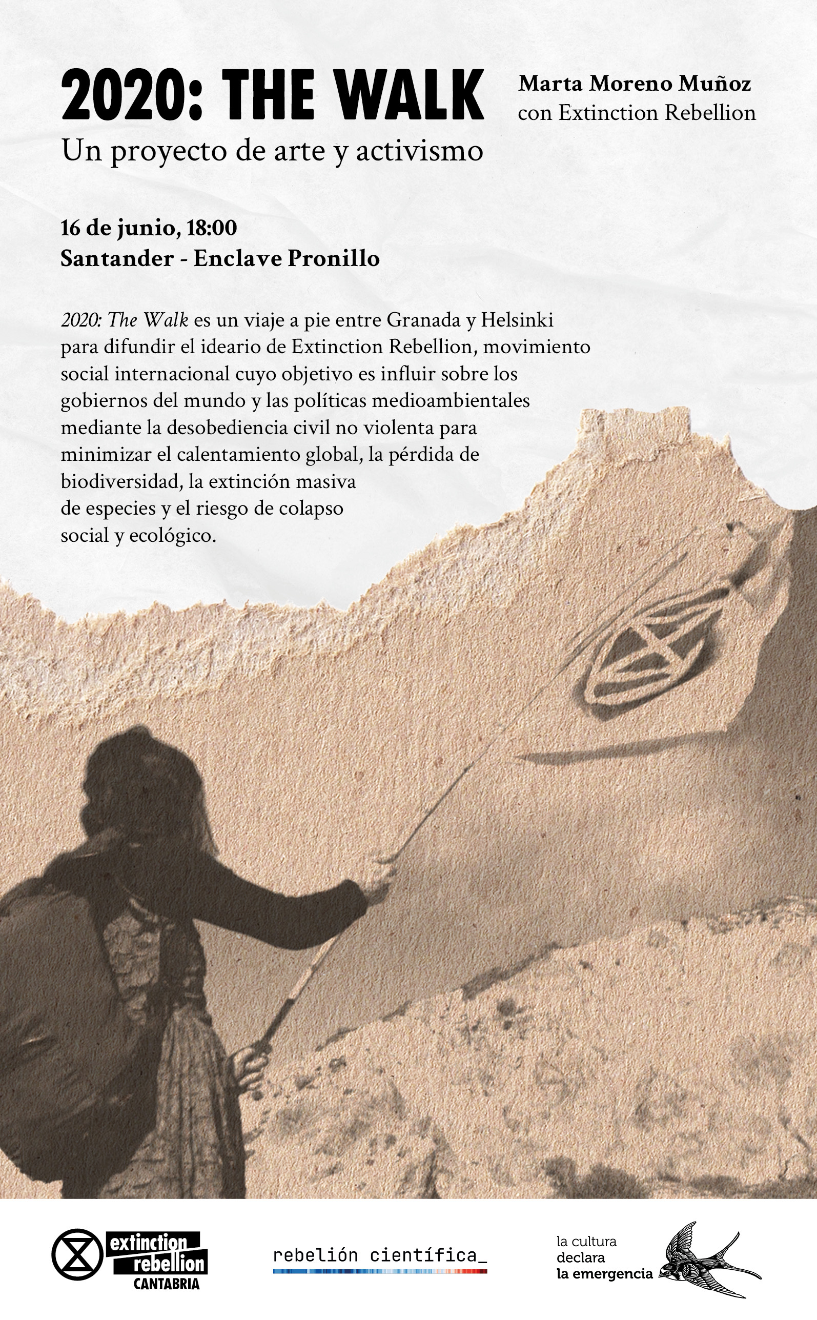 “2020: The Walk” es un proyecto de arte y activismo concebido en el seno del colectivo Rebelión o Extinción (XR), al que la artista e investigadora pertenece desde sus inicios. Extinction Rebellion es un movimiento social internacional cuyo objetivo es influir sobre los gobiernos del mundo y las políticas medioambientales mediante la desobediencia civil no violenta para minimizar el calentamiento global, la pérdida de biodiversidad, la extinción masiva de especies y el riesgo de colapso social y ecológico.